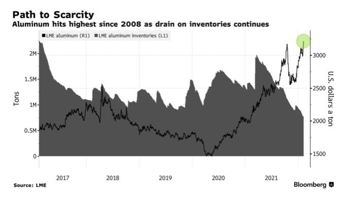 数据显示,伦敦金属交易所(LME)指标期铝周二盘中一度上涨3.3%,触及每吨3236美元,超过了去年10月高点,达到2008年以来的最高水平。