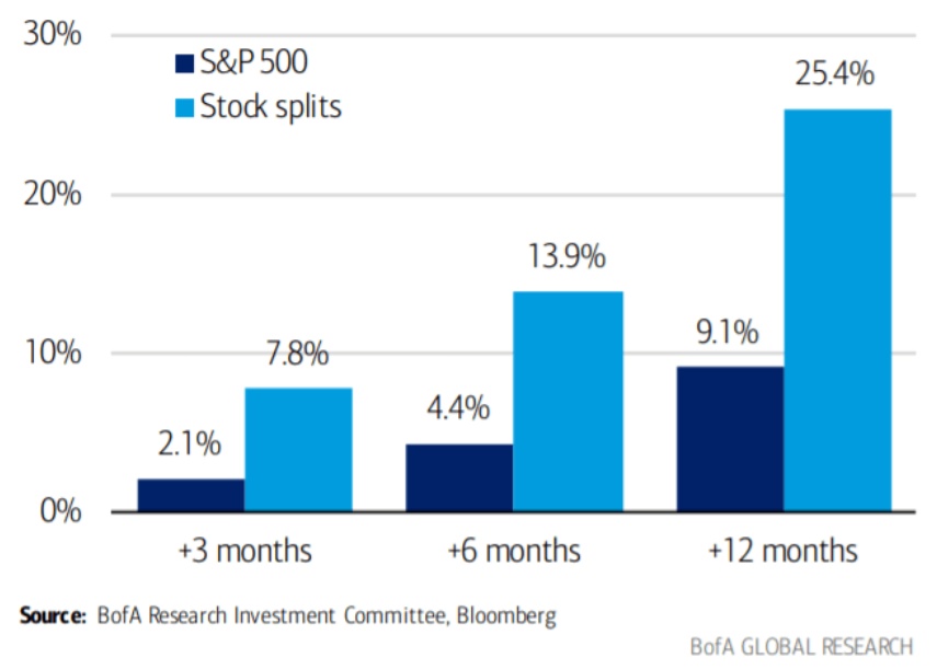 此外,根据彭博社自1980年以来的企业行动数据,标普500指数中宣布分股的成分股在首次宣布分股后3个月、6个月和12个月的表现明显优于该指数。在接下来的12个月里,分拆的股票平均上涨了25%,而大盘指数的涨幅为9%。