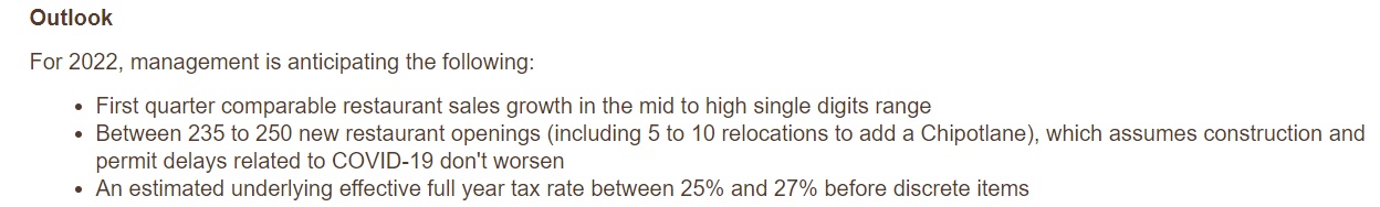 奇波雷墨西哥烧烤预计,2022年将有235至250家新餐厅开张,前提是营业许可和建设因疫情而推迟的情况不会恶化。去年第四季度,该公司新开了78家分店。