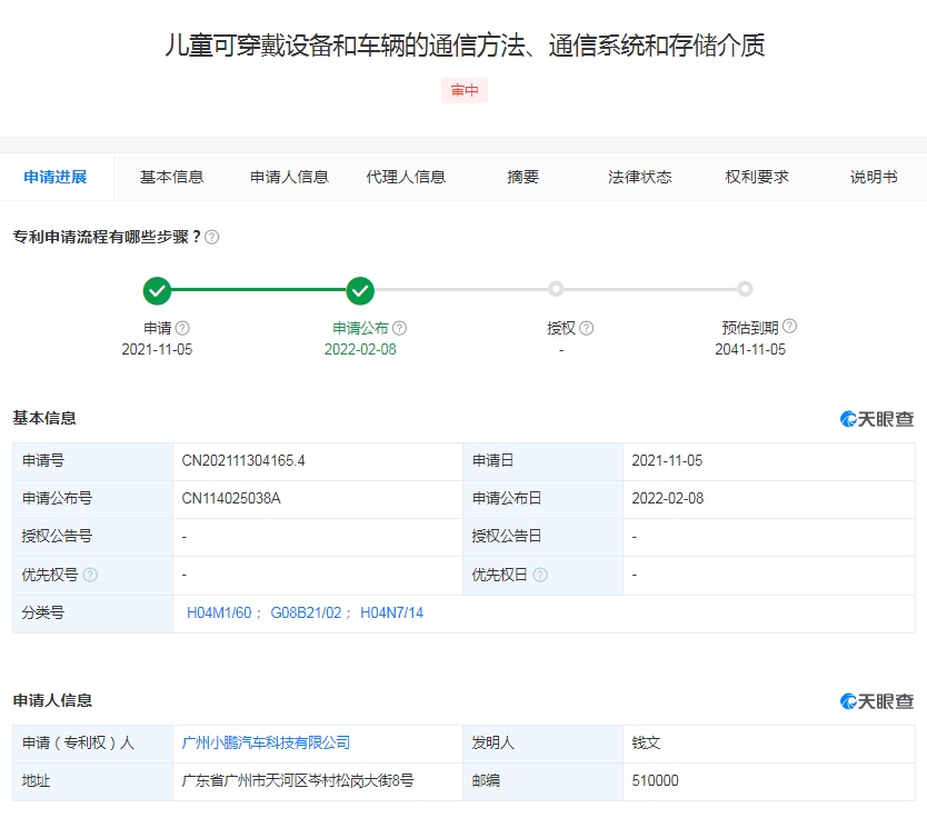智通财经APP获悉,据天眼查App显示,2月8日,广州小鹏汽车科技有限公司申请的“儿童可穿戴设备和车辆的通信方法、通信系统和存储介质”专利公布。摘要显示,本发明将儿童可穿戴设备与车辆进行绑定,车机端获取设备信息;在预设场景下,车机端可反馈儿童可穿戴设备的信息或提示询问信息,从而使用户在用车环境下也能及时对预设场景做出反应。