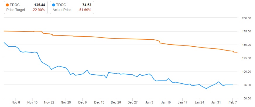 近三个月,华尔街分析师们对Teladoc Health目标价平均下调幅度接近23%。