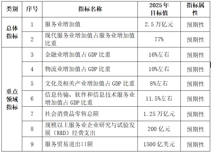 综合竞争力显著提升。服务业总体规模稳步扩大,服务业结构更加优化,服务业劳动生产率处于国内领先水平,经济社会发展主动力和新引擎功能进一步巩固。到2025年,服务业增加值突破2.5万亿元,现代服务业增加值占服务业增加值比重达77%。