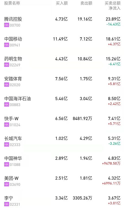 快手-W(01024)获净买入10.36亿港元。消息面上,据媒体报道,快手电商将2022年的总成交额(GMV)目标区间定在9000亿元至9700亿元。据悉,快手2021年完成电商GMV 6800亿元,超过原定目标6500亿元 ,也高于外界预期。此外,多家券商对快手年度业绩给出预测。机构相信,公司在2021年Q4收入将录得25%以上增长,Non-Gaap经调整净亏损收窄有望超预期。天风证券指出,公司组织架构调整后提效控费能力大概率超预期。值得一提的是,北水资金连续8天净买入快手,累计净买入金额39.57亿港元。