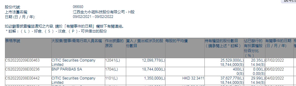 智通财经APP获悉,香港联交所最新资料显示,2月4日,CITIC Securities Company Limited增持金力永磁(06680)135万股,每股作价32.3411港元,总金额约为4366.05万港元。增持后最新持股数目约为3762.78万股,最新持股比例为29.99%。