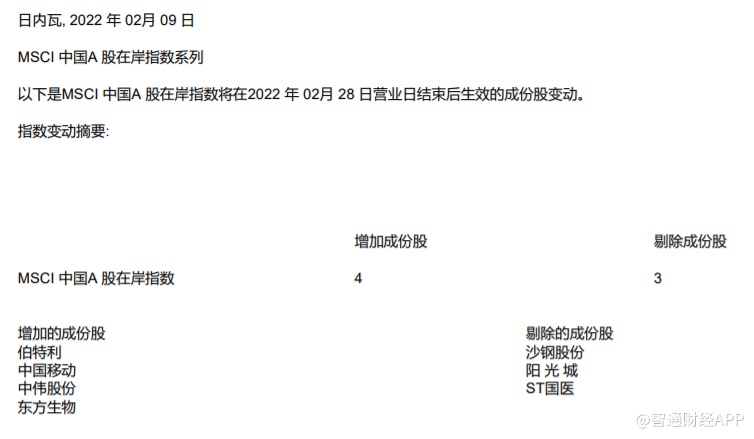 新增中国移动(600941.SH)、中伟股份(300919.SZ)、东方生物(688298.SH)、伯特利(603596.SH)等四只股票至MSCI中国A在岸指数,删除沙钢股份(002075.SZ)、阳光城(000671.SZ)、ST国医(000516.SZ)。