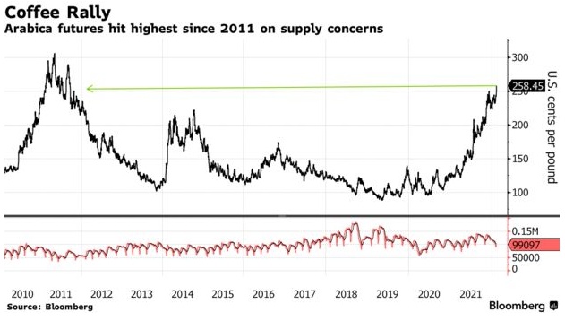 周三,阿拉比卡咖啡豆期货的价格在市场上涨3.6%,收于每磅2.5845美元,为2011年9月以来的最高收盘价。其他软性大宗商品中,原糖连续第二天上涨,可可的价格也出现了上涨。