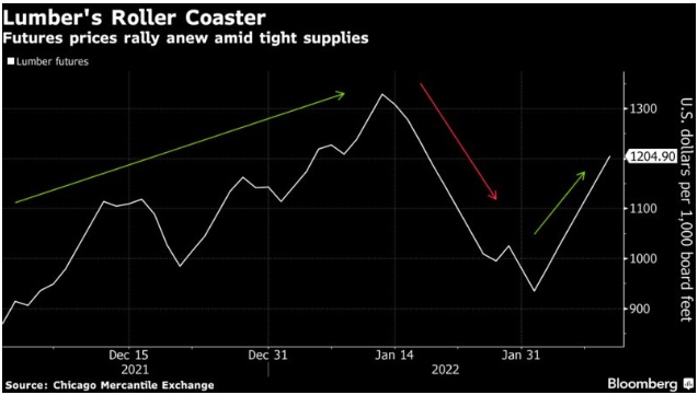 智通财经APP获悉,周三,木材期货收复近期失地,连续六个交易日上涨,触及每千板英尺1,204.90美元,为三周以来的最高水平。在1月份价格暴跌后,美国寒冷天气和运输瓶颈的环境下,建材旺季前的紧张库存或将推动价格反弹。