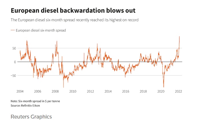 欧洲柴油供应紧张正加剧,推动该地区6个月期柴油价差周一升至每吨100美元以上,为有记录以来最大的现货溢价。