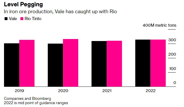 现在,两家公司的产量已经持平,甚至在2022年的产量预测都是3.2 - 3.35亿吨,不过,力拓的预测是出货量,淡水河谷的预测是生产量。