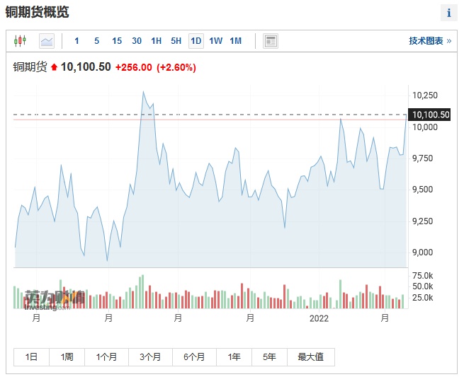 截至发稿,LME期铜涨2.60%,报10100.50美元/吨。