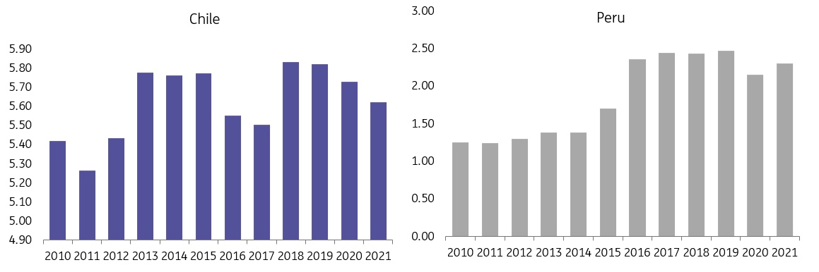 在铜产量方面,主要生产国智利的最新数据显示,2021年总产量约为562万吨,同比下降1.9%,主要是受埃斯康迪达铜矿(Escondida)产量下降的拖累。第二大生产国秘鲁2021年的铜产量则强劲反弹,同比增长7%至230万吨,但仍略低于疫情前的峰值。