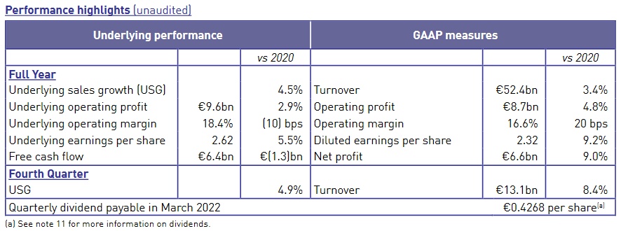 财报透露,该公司于2021年完成了30亿欧元的股票回购,并宣布计划在2022至2023年期间将继续回购30亿欧元股票。该公司还宣布,将于2022年3月支付的季度股息为每股0.4268欧元。