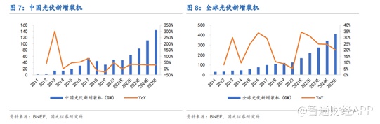 随着碳达峰、碳中和目标提出,全球光伏新增装机预期提升,国元证券预计2021-2025 全球新增装机量分别达到168GW、218GW、273GW、341GW和410GW,年均复合增速约26.8%,年均中国新增装机量分别达到47GW、64GW、85GW、110GW和143GW。“十四五”规划期间中国年均新增装机量约90GW,年均符合增速约24.2%,约占期间全球光伏新增装三分之一。