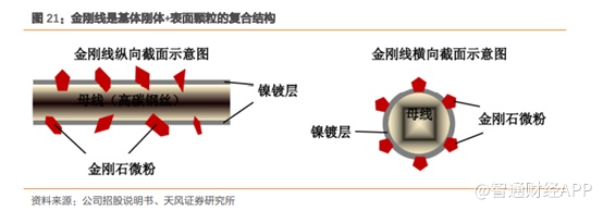 纵观金刚线的发展,其出现始于对传统砂浆线切割技术的替代。从原理上看,是用电镀的方法在钢线基体上沉积一层金属镍,金属镍层内包裹有金刚石颗粒,使金刚石颗粒固结在钢线基体上,从而制得的一种线形超硬材料切割工具。