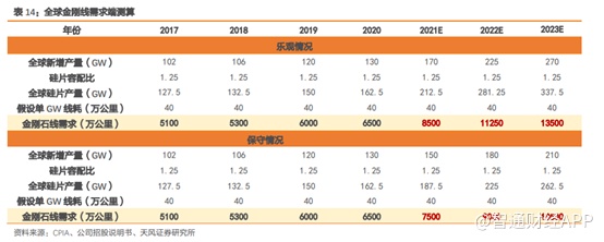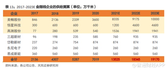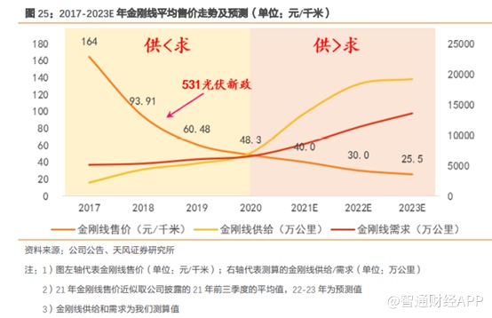 从需求端来看,保守情况下,天风证券预计2021-2023年金刚线需求端7500、9000和10500万公里;乐观情况下,预计2021-2023年金刚线需求端为8500、11250和13500万公里。