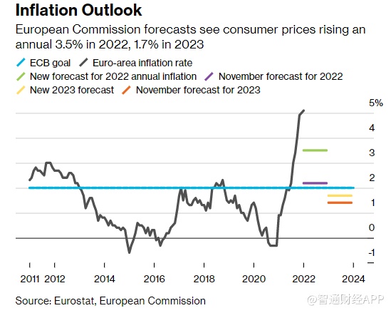 在经济增长方面,欧盟委员会目前预计,欧元区2022年的国内生产总值(GDP)将增长4%,2023年将增长2.7%。相比之下,欧盟委员会去年11月预计2022年GDP增长4.3%,2023年增长2.4%。