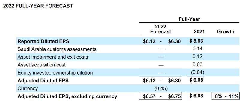 展望未来,该公司预计2022财年,摊薄后每股收益以及经调整的摊薄后每股收益均在6.12-6.30美元之间。
