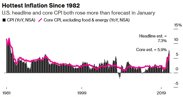 智通财经APP获悉,美国1月CPI年率未季调为7.5%,预期7.2%,前值7%,继续创下自1982年来新高。美国1月核心CPI年率未季调为6%,预期5.9%,前值5.5%。