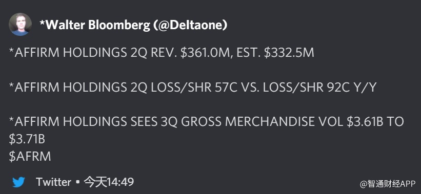 Affirm随后公布的财报数据显示,公司Q2营收为3.61亿美元,超过市场预期;净亏损为1.597亿美元,合每股亏损57美分,而去年同期亏损2,660万美元,合每股亏损38美分。商品交易总额为45亿美元,高于去年同期的21亿美元,也高于预期的37亿美元。