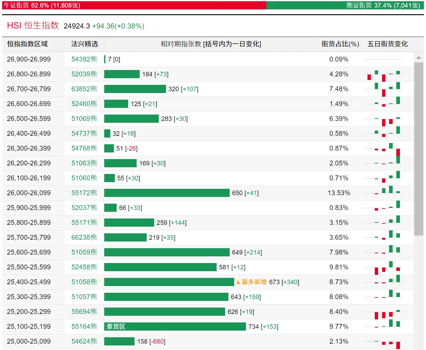 法兴恒指牛熊证街货分布图中的数据显示,熊证街货重货区在25100-25199区间,该区间最新熊证数量为734张,较上一交易日增加153张;最多新增在25400-25499区间,该区间最新熊证数量为673张,较上一交易日增加340张。