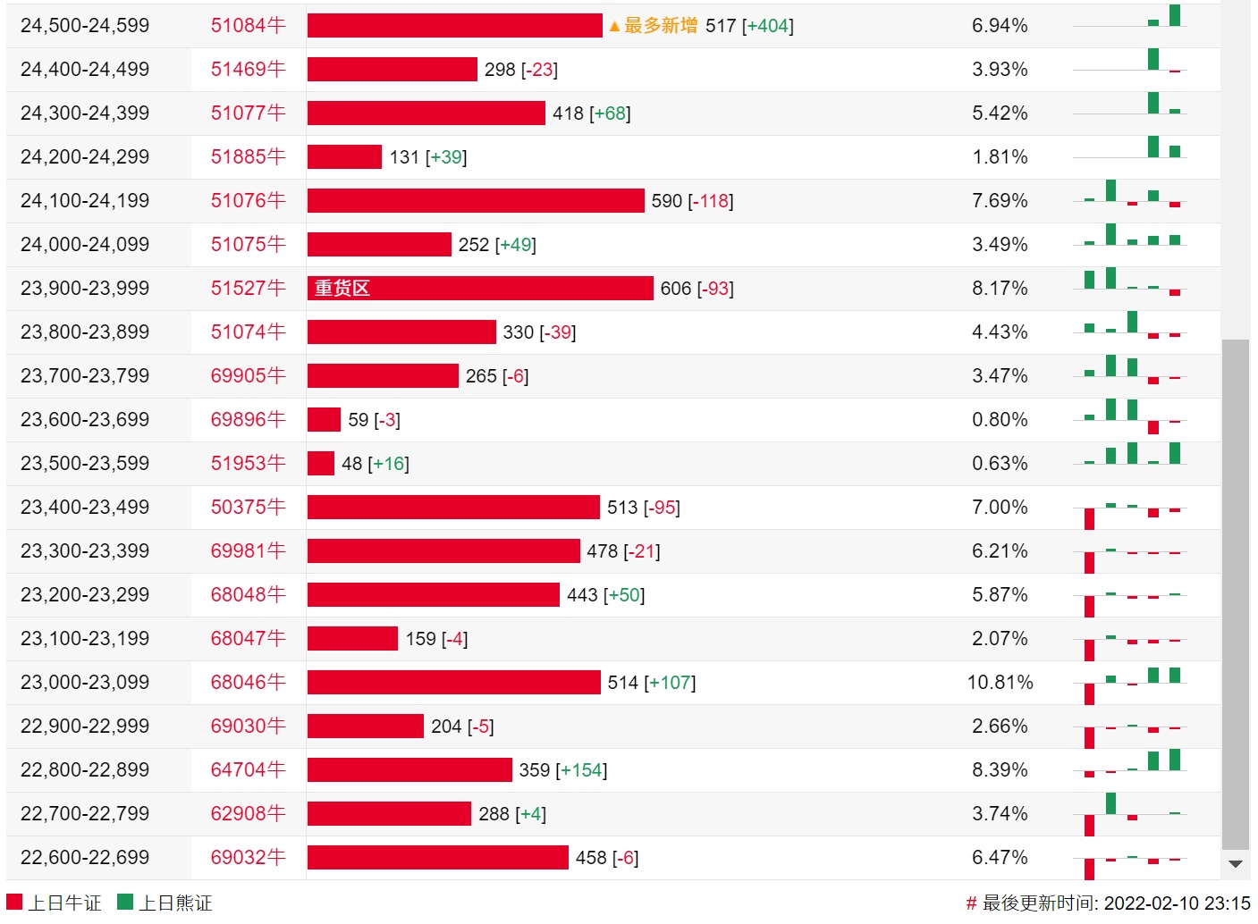 牛证街货重货区在23900-23999区间,该区间最新牛证数量为606张,较上一交易日减少93张;最多新增在24500-24599区间,该区间最新牛证数量为517张,较上一交易日增加404张。
