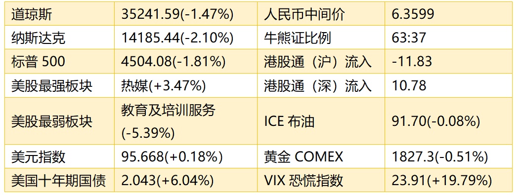 1.隔夜美股截至收盘,道指跌526.47点,跌幅为1.47%,报35241.59点;纳指跌304.73点,跌幅为2.10%,报14185.64点;标普500指数跌83.10点,跌幅为1.81%,报4504.08点。港股ADR指数下跌,按比例计算,收报24837点,较香港收市跌87.24点,幅度为0.35%。