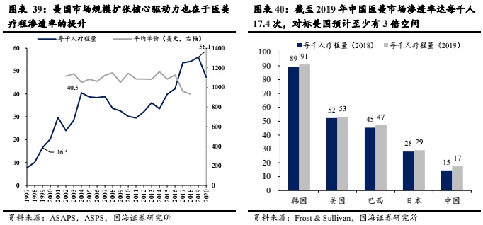 根据上述研报披露,目前中国医美市场渗透率大体相当于美国1999年水平,美国1999-2004年渗透率由17次提升至40.5次,但彼时美国整体经济体量与消费水平均远高于我国,且有玻尿酸、肉毒素、激光脱毛等轻医美产品陆续上线催化,因此预计美国的医美产业发展路径仅可作为极度乐观情况下的参考。