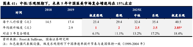 据国海证券分析师团队测算,以2019年中国医美疗程渗透率同比提升2.9次/每千人为基准进行不同假设,在极度悲观、悲观、中性、乐观及极度乐观的预期下,2019-2025年中国医美疗程渗透率年均分别提升1、2、2.5、3.5、3.85次,对应5年复合增速分别为6.1%、11.1%、13.2%、17.2%、18.4%。
