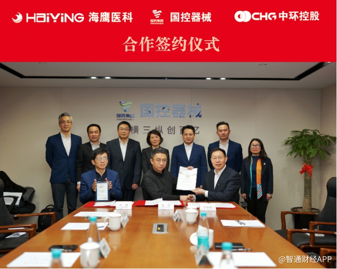 (图:中环控股集团执行董事李梦琳,国控器械副总经理戴晖及海鹰医科叶刚代表三方签署代理合作协议,中环控股集团董事长余竹云,国控器械副总经理胡媚媚(主持工作)及海鹰医科董事长虞敏浩等共同见证签约仪式。)