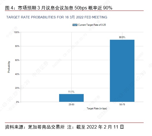 从CPI数据公布后的资产表现看,市场当前预期较为混乱,恐慌情绪严重。10年期美债收益率突破2%,并维持高位震荡。但美元指数则经历较大波动,数据公布后,美元指数迅速拉升至接近96,此后又快速回落至95.2附近,而在布拉德鹰派讲话后,又拉升至接近96,体现市场敏感而混乱的预期。从芝加哥商品交易所FedWatch数据看,当前市场押注美联储3月加息50bps的概率在90%附近,较此前大幅提升,而从全年维度看,当前市场更是认为每次议息会议均会决定加息。在此影响下,美股三大指数均大幅下跌,纳指领跌,跌幅超2%,市场恐慌情绪蔓延。