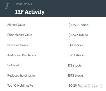据统计,贝莱德Q4持仓总市值达3.928万亿美元,上一季度持仓总市值为3.572万亿美元,环比上涨10%。贝莱德在四季度的持仓组合中新增了347只个股,增持了3583只个股;同时减持了1573 只个股,清仓了172 只个股。其中,前十大持仓标的占总市值的 20.28%。