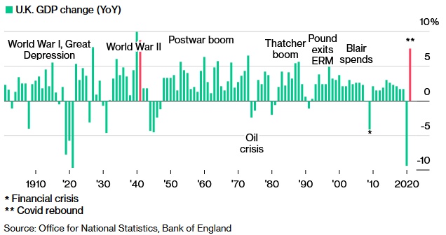在因疫情经历了比其他主要经济体更严重的衰退(2020年GDP萎缩9.4%)之后,英国经济经历了强劲的复苏。这得益于数十亿英镑的政府救助,以支持就业和帮助企业度过危机。英国财政大臣苏纳克(Rishi Sunak)表示:“多亏了一揽子的支持措施、以及在正确的时间里做出了正确的决定,经济一直非常有弹性。”