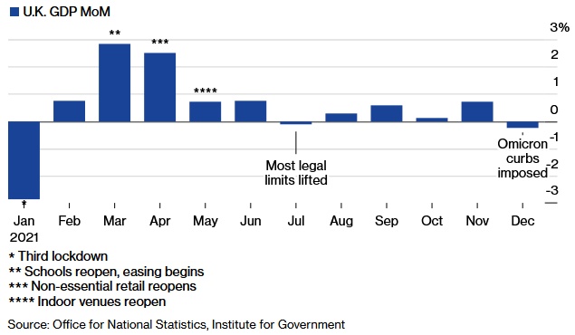英国12月GDP的下滑主要原因在于服务业收缩了0.5%,零售商们因政府实施限制措施以遏制Omicron变异株的蔓延而受到客流量大幅下降的影响,许多服务接待场所在圣诞节前也因为疫情被大量取消了订单。