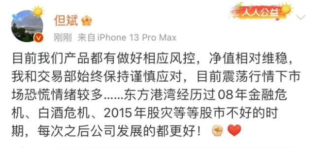 智通财经APP获悉,据《每日经济新闻》记者不完全统计,截至2022年1月28日,东方港湾但斌旗下包括东方港湾驰程1号、东方港湾宏远3期、东方港湾宏远2期、东方港湾华远八期、东方港湾价值投资25号在内的合计超50只私募产品的单位净值跌破了0.8元传统的警戒线,另外还有6只产品净值跌破了0.7元的传统止损线。对此,但斌在微博回应:“目前我们产品都有做好相应风控,净值相对维稳,我和交易部始终保持谨慎应对,目前震荡行情下市场恐慌情绪较多……东方港湾经历过2008年金融危机、白酒危机、2015年股灾等等股市不好的时期,每次之后公司发展得都更好!”
