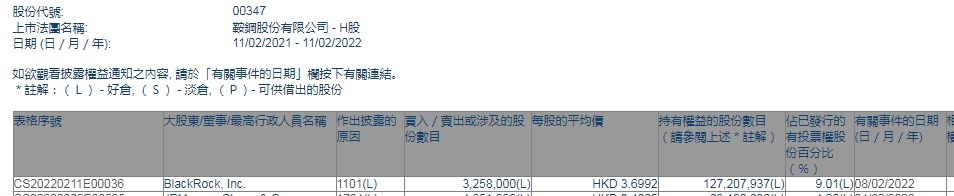 智通财经APP获悉,香港联交所最新资料显示,2月8日,贝莱德增持鞍钢股份(00347)325.8万股,每股作价3.6992港元,总金额约为1205.20万港元。增持后最新持股数目约1.27亿股,最新持股比例为9.01%。