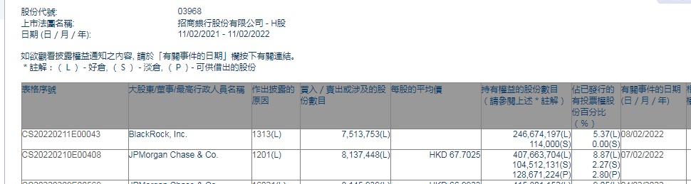 智通财经APP获悉,香港联交所最新资料显示,2月7日,小摩减持招商银行(03968)813.7448万股,每股作价67.7025港元,总金额约为5.51亿港元。减持后最新持股数目约为4.08亿股,最新持股比例为8.87%。