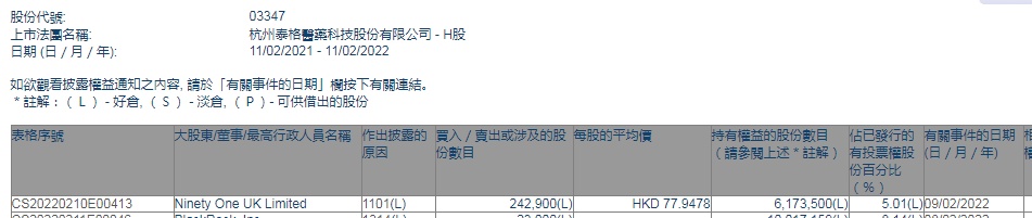 智通财经APP获悉,香港联交所最新资料显示,2月9日,NINETY ONE UK LIMITED增持泰格医药(03347)24.29万股,每股作价77.9478港元,总金额约为1893.35万港元。增持后最新持股数目为617.35万股,最新持股比例为5.01%。
