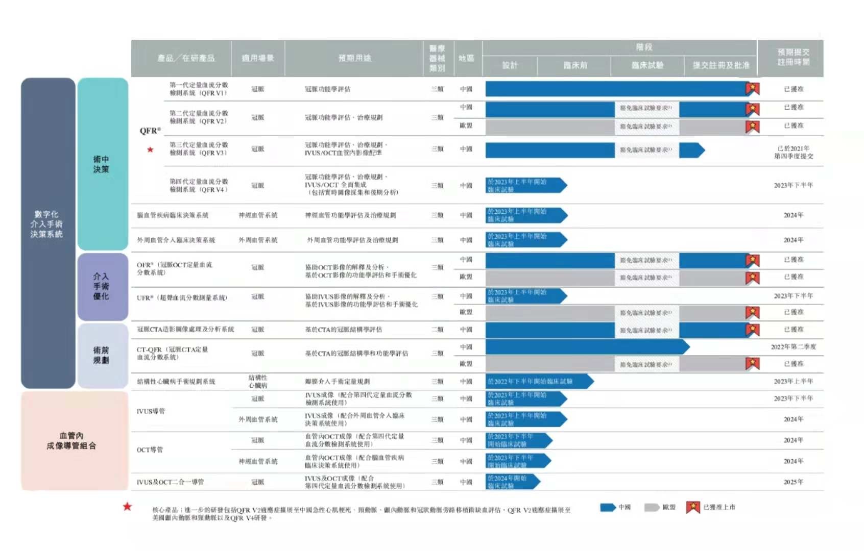 此外,公司已自主开发含有11款产品及在研产品的综合协同性产品组合,其中五款已于中国或欧盟或同时于两地取得商业化批准。根据弗若斯特沙利文的资料,公司是世界上首家且迄今为止唯一一家获得批准将涵盖所有主要泛血管介入评估手段(即CAG、IVUS及OCT以及无创CTA检测)的影像及生理学产品商业化的解决方案提供商。