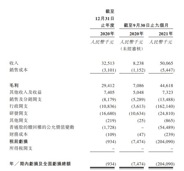 据招股书显示,于2020年度,博动医疗的收入为人民币3251.3万元,毛利为2941.2万元。于2021年前九个月,博动医疗的收入为人民币5006.5万元,毛利为4461.8万元。
