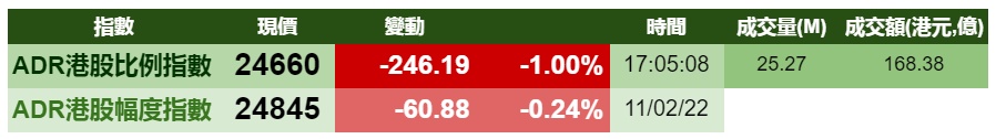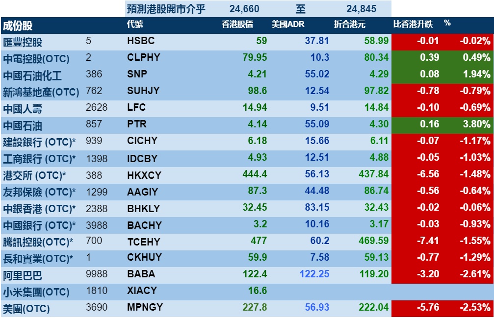 智通财经APP获悉,周五美股三大指数集体收跌,港股ADR指数下跌,按比例计算,收报24660点,较香港收市跌246.19点,幅度为1%。