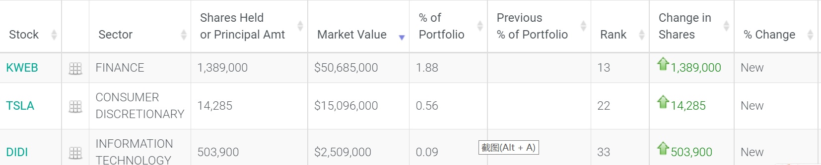值得注意的是,景林新建仓了特斯拉(TSLA.US)、滴滴(DIDI.US)、KraneShares中国海外互联网ETF。