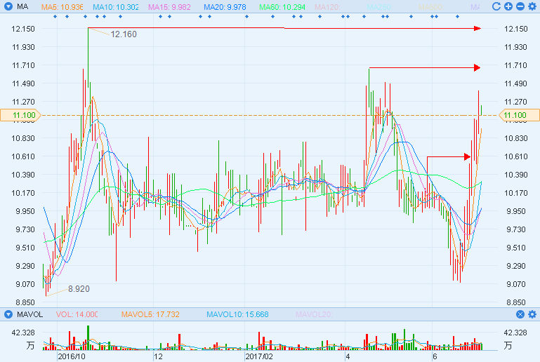 如上图所示,这个价格距离第二个阻力点11.66仅有0.56港元,而一旦突破该阻力点,距离2016年高点12.16也就不远了,如果公司业绩表现良好,不排除股价回到15元以上的可能性。