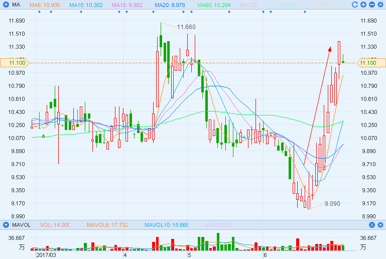 最后,从技术图形上看,本周畅捷通的股价已经突破了第一个阻力点10.6港元,截至本周四(6月30日)收盘报11.1港元: