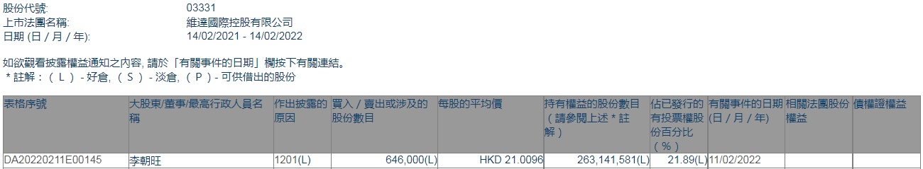 智通财经APP获悉,香港联交所最新资料显示,2月11日,董事长李朝旺减持维达国际(03331)64.6万股,每股作价21.0096港元,总金额约为1357.22万港元。减持后最新持股数目约为2.63亿股,最新持股比例为21.89%。