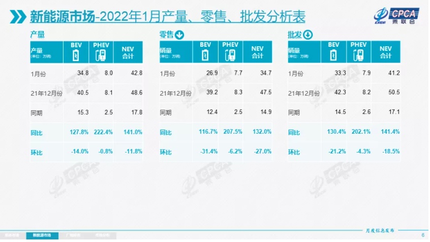 1月新能源乘用车批发销量达到41.2万辆,同比增长141.4%,环比下降18.5%,环比降幅与2021年1月特征一致。1月新能源乘用车零售销量达到34.7万辆,同比增长132.0%,环比下降27.0%,环比降幅与2021年1月的25%特征基本一致。