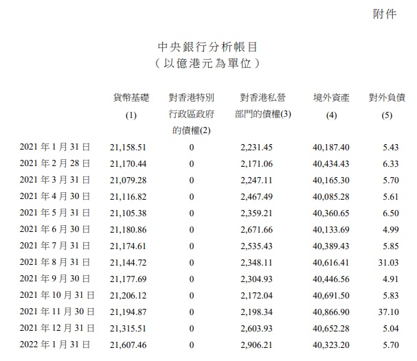 货币基础为21,607亿港元,包括负债证明书、政府发行的流通纸币及硬币、银行体系结余,以及已发行外汇基金票据及债券。