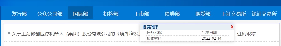 智通财经APP获悉,2月14日,证监会公布上海微创医疗机器人(集团)股份有限公司(02252)的《境外增发股份(包括普通股、优先股等各类股票及股票的派生形式)审批》进度,目前进度已达接收材料阶段。