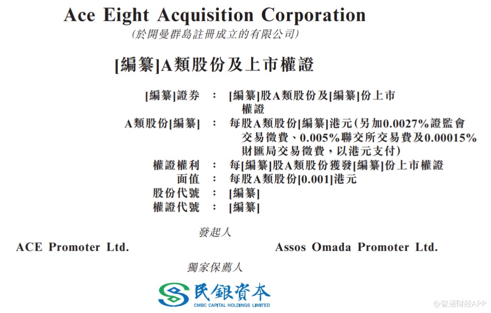 智通财经APP获悉,据港交所2月14日披露,Ace Eight Acquisition Corporation向港交所主板提交上市申请,民银资本为独家保荐人。