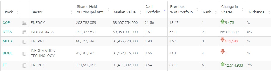Energy Transfer(ET.US)位列第五,持仓约1.71亿股,持仓市值约14.12亿美元,较上季度持仓数量增加了7%,占投资组合比例为3.54%。