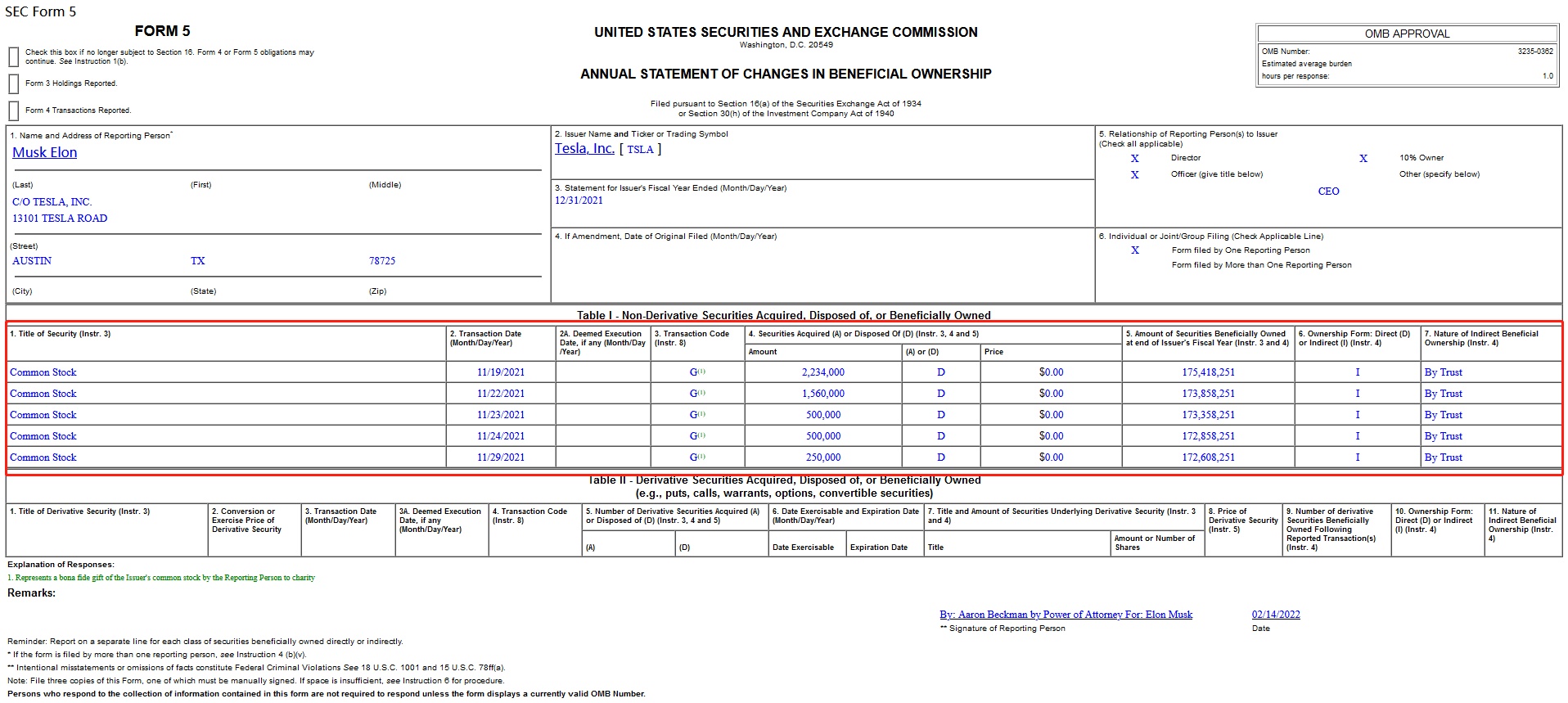 智通财经APP获悉,特斯拉(TSLA.US)CEO马斯克在向美国证券交易委员会(SEC)递交的F5报告中称,他于去年11月19-29日期间向一家名称不祥的慈善机构捐赠了超过500万股特斯拉股票。若按出售股票当天的平均价格计算,这笔捐赠价值约为57亿美元,是历史上捐给慈善机构的最大一笔捐赠之一。